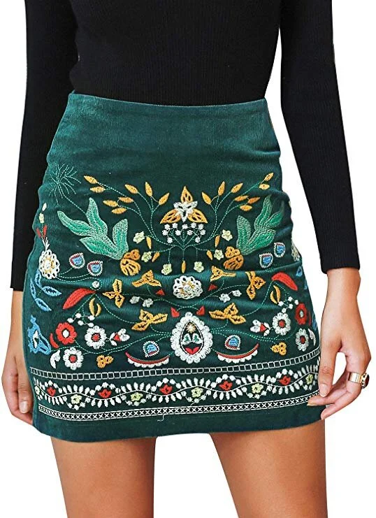 BerryGo Women's High Waist Embroidered Mini Skirt Boho Floral Pencil Skirt- In green
